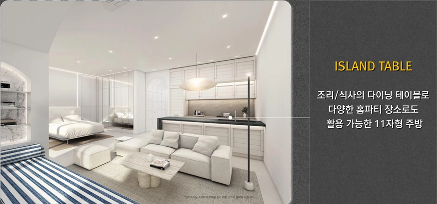 럭셔리 키친을 완성하는 약 2.7m(*54A타입 기준)의 아일랜드 테이블과 '11'자형 주방
